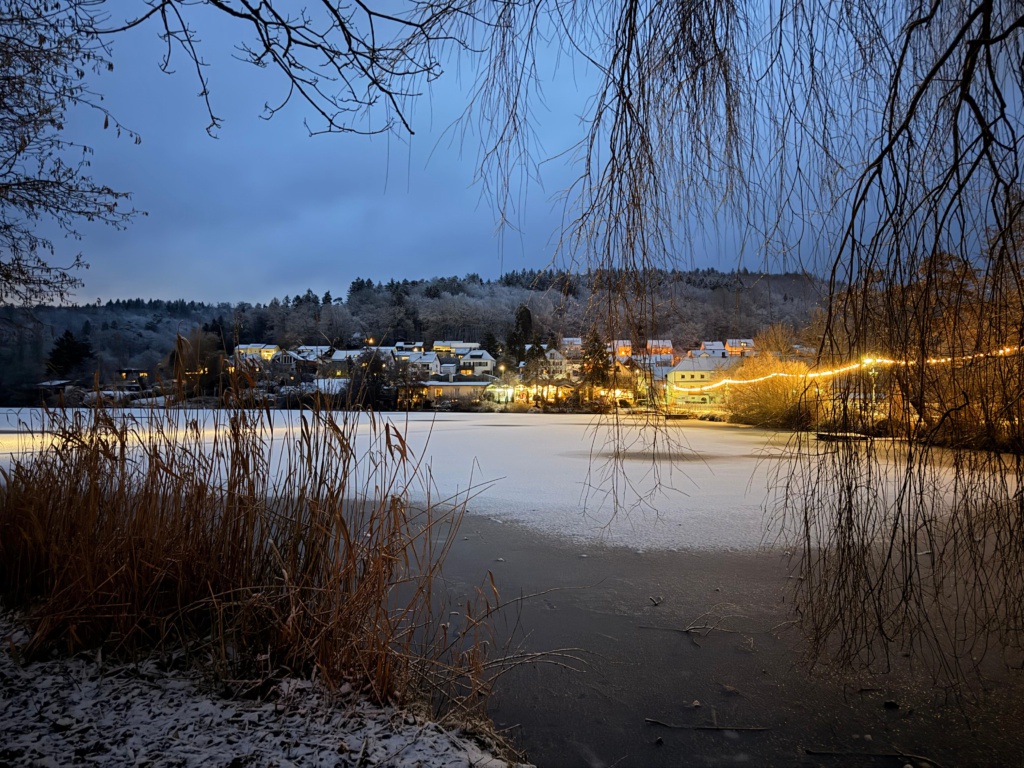 Der Winter hat sich heute von seiner schönen Seite gezeigt: Schnee, Kälte und eine scheinbar geschlossene Eisfläche auf dem Weiher in Niederwürzbach. So gut das Ganze auch aussieht – bitte nicht täuschen lassen!