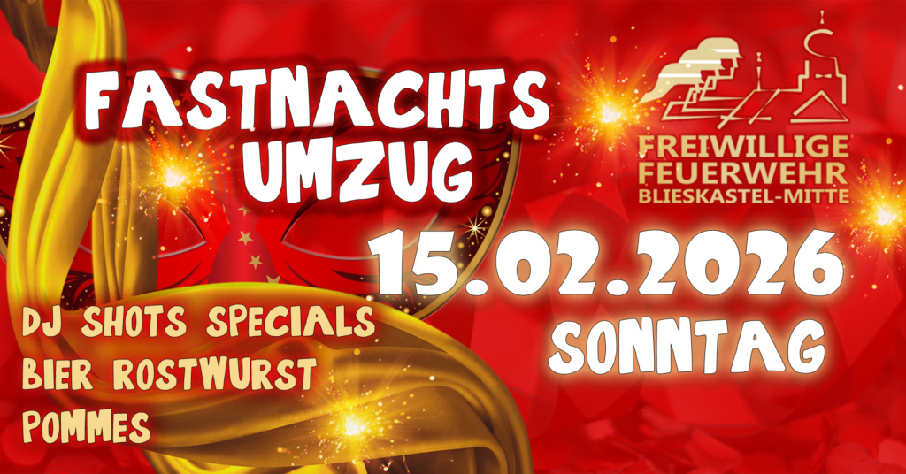 Am Fastnachtssonntag wird die Feuerwache der Feuerwehr Blieskastel-Mitte wieder zur närrischen Partyzone. Ab 13:11 Uhr öffnen sich die Tore zur großen Fastnachtssause – direkt vor, während und nach dem Blieskasteler Umzug.