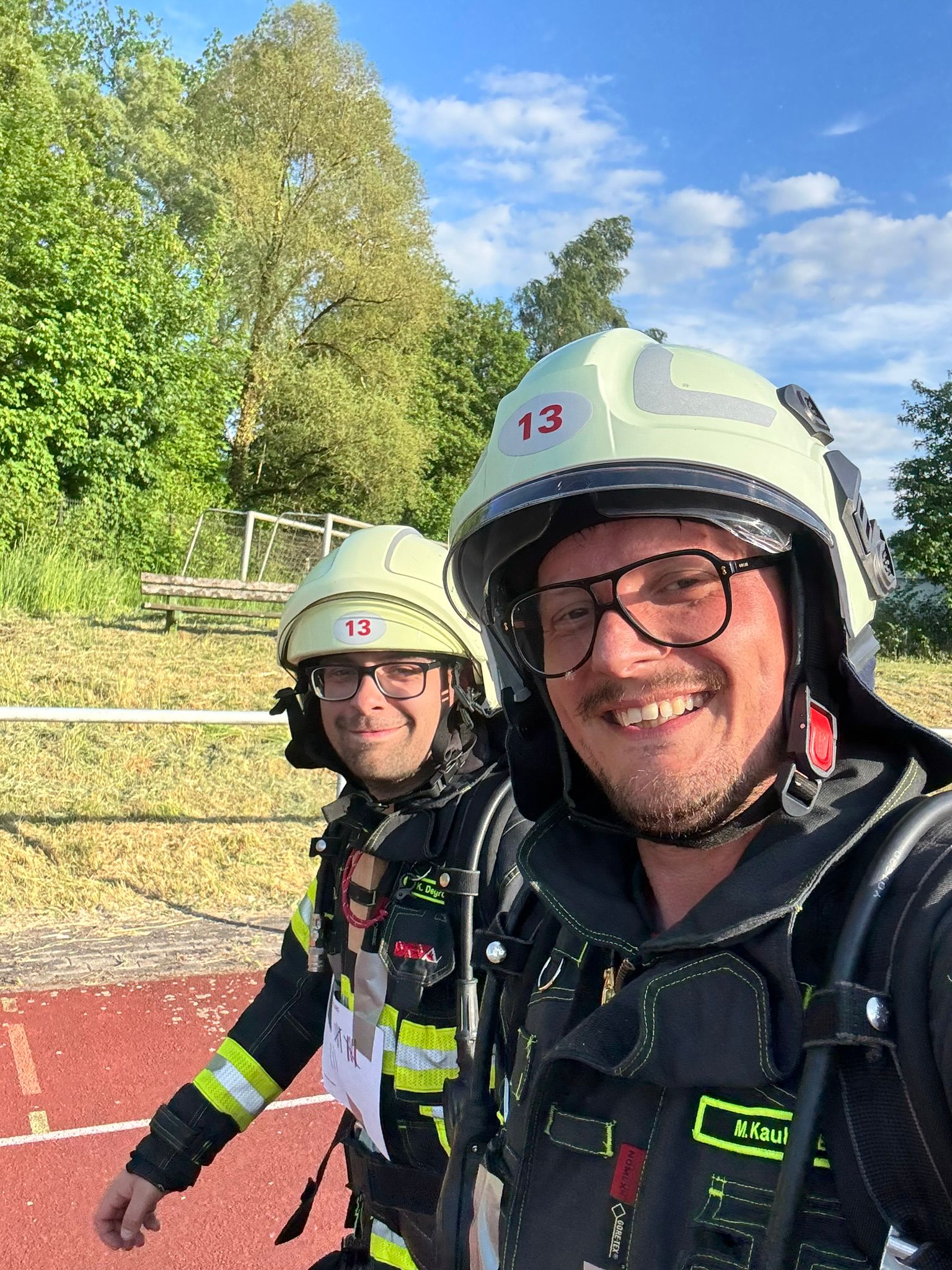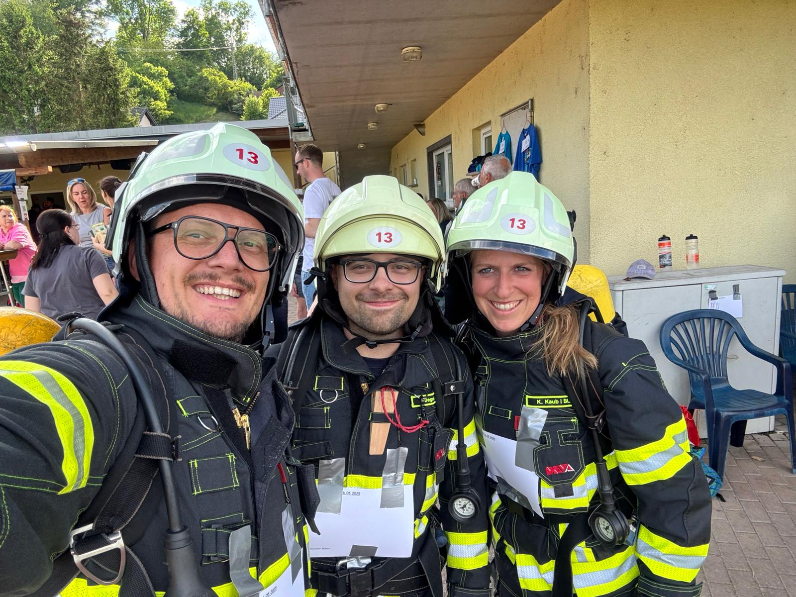 Ausgestattet mit Teilen ihrer Einsatzkleidung – darunter auch ein Atemschutzgerät (ohne Maske und nicht angeschlossen) – absolvierten sie gemeinsam starke 52 Runden auf der 400-Meter-Bahn und setzten damit ein sichtbares Zeichen für Solidarität, Hilfsbereitschaft und Gemeinschaft.